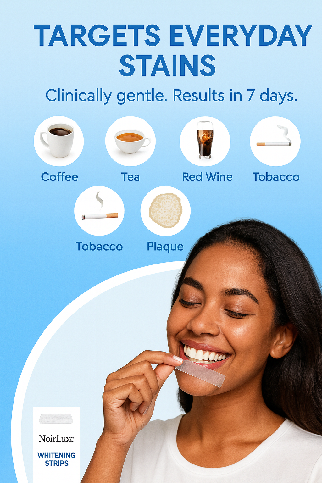 Peel a NoirLuxe no-slip strip, dry your teeth, and press it on. Our saliva-blocking dry-strip design keeps the dentist-inspired whitening gel in close contact with your enamel for 30 minutes, so it can lift coffee/tea/wine stains without the sting. Remove, rinse, smile—repeat nightly and see a visible shade change in days.